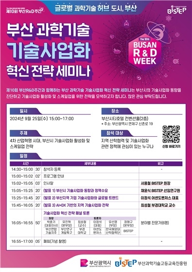 부산과학기술고등교육진흥원(BISTEP)이 오는 25일 부산시티호텔에서 '부산 과학기술 기술사업화 혁신 전략 세미나'를 개최한다고 밝혔다. 이번 세미나는 '2024 부산R&D주간'의 프로그램과 연계돼 진행되며, 부산시의 기술사업화 추진동향을 진단하고 기술사업화 활성화 및 스케일업 전략을 논의하는 자리가 될 예정이다.
