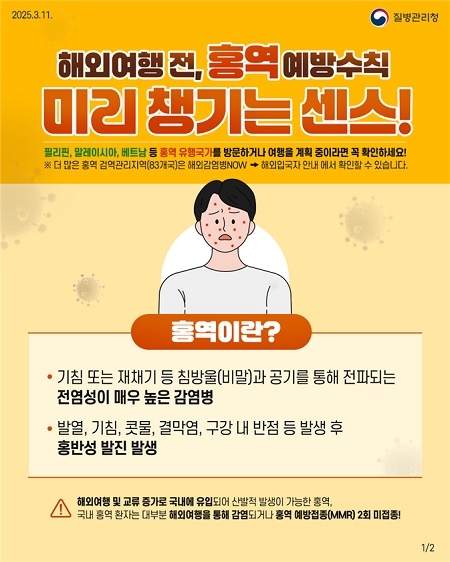 특히, 면역체계가 취약한 6~12개월 미만 영유아는 홍역 유행 국가 방문을 최대한 자제하고, 방문이 불가피하다면 예방접종 후 방어면역 형성까지의 기간(보통 2주)을 고려해 출국 전에 홍역 가속 예방접종을 받을 것이 권고된다.