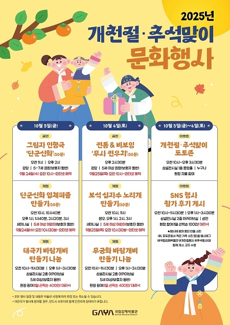 이 밖에도 행사 기간 동안 상설전시실에서는 관람객들에게 ‘개천절·추석맞이 포토존’과 ‘태극기·무궁화 바람개비 만들기 나눔 행사’도 마련될 예정이다. 행사 참가 후기를 SNS에 게시하면 돌림판을 돌려 박물관 스티커·손수건 등 다양한 기념품도 제공된다.