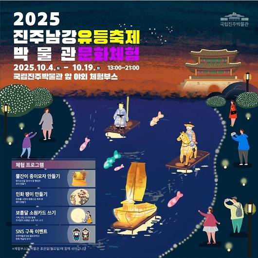 국립진주박물관은 2025 진주남강유등축제 기간(10.4~19) 동안 오후 1시부터 9시까지 박물관 앞마당에서 다양한 체험 프로그램을 운영한다고 23일 밝혔다. 이번 프로그램은 지역 대표 문화축제와 국립박물관이 함께 어우러져 지역민과 관광객 모두에게 더욱 풍성한 문화 경험을 제공하고자 마련됐다.