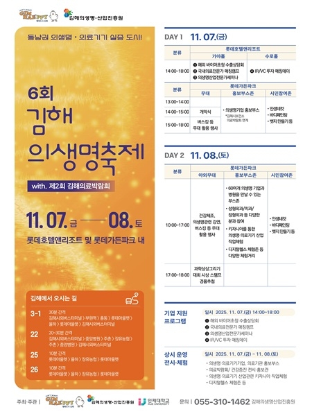 경남 김해시가 주최하고, 김해의생명산업진흥원이 주관하는 '제6회 김해의생명축제'가 오는 11월 7일부터 8일까지 이틀간 롯데호텔앤리조트와 롯데가든파크 일원에서 열린다.