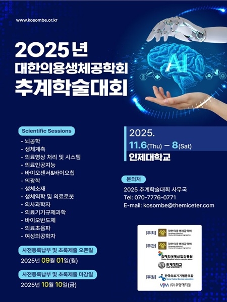 한편 축제기간 함께 개최되는 대한의용생체공학회 추계학술대회는 인제대학교에서 개최되며 의료AI, 뇌공학, 생체계측, 의료영상 처리 및 시스템, 바이오센서, 바이오칩, 의광학, 생체소재, 생체역학 및 의료 로봇 등 첨단 의생명 분야를 주제로 진행된다. 이를 통해 인제대 학생들에게도 학문적 지식과 최신 연구 성과를 공유하는 기회가 제공될 예정이다.