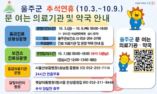 울주군 지역응급의료기관인 ‘서울산보람병원’은 24시간 응급의료진료가 가능하며, 달빛어린이병원인 ‘햇살아동병원’은 추석 당일을 제외한 나머지 기간 오전 9시부터 오후 6시까지 소아와 성인을 대상으로 운영한다.