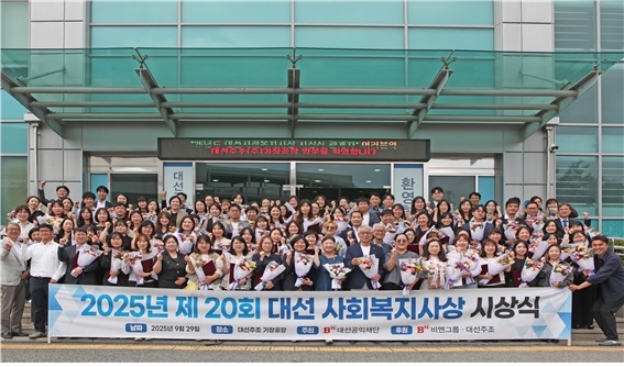대선공익재단이 지난 29일 대선주조 기장공장에서 ‘2025년 제20회 대선 사회복지사상 시상식’을 성황리에 마무리 했다고 30일 밝혔다. 이날 시상식에는 대선공익재단 조성제 이사장을 비롯해 수상자, 부산·울산·경남 사회복지사협회 관계자 100여 명이 참석해 자리를 빛냈다.