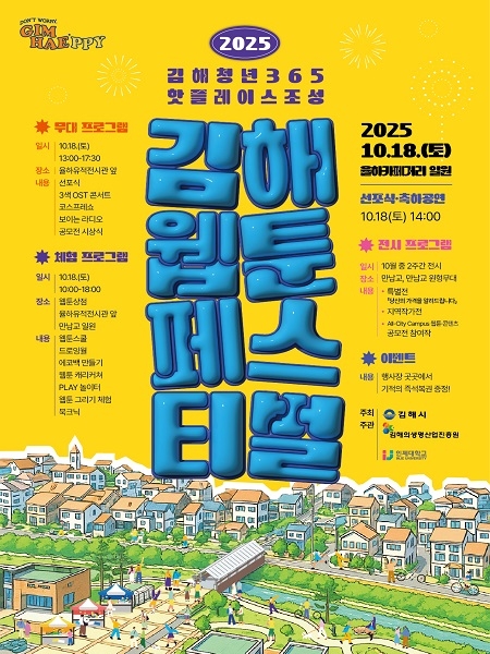 김해시는 웹툰이라는 청년 친화적이고 대중성 높은 콘텐츠를 첫 프로그램으로 선정했다. '2025 김해 웹툰 페스티벌'은 18일 김해율하카페거리 일원에서 개최되며 웹툰 전시, 작가 토크쇼, 창작 체험, 청년 플리마켓, 지역상권 연계 이벤트 등 다양한 프로그램으로 구성된다.