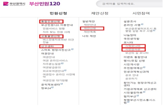 민원인은 ‘부산민원120’의 온라인 민원창구를 통해 건의, 질의, 고충 등 각종 민원을 신청할 수 있으며, 각 소관 부서에서는 온라인으로 답변을 제공하는 방식으로 처리된다. 또한 ‘소방재난본부 민원상담’과 ‘상수도사업본부 시민참여’ 창구도 함께 운영돼, 각 분야별로 민원을 온라인으로 접수하고 처리 결과를 확인할 수 있다.