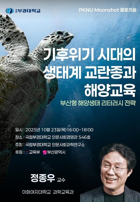 정 교수는 과학적 사실에 기반한 생태교육 및 기후위기 교육의 선도적 실천가로 평가받고 있으며, 이날 강연에서는 ‘생태계 교란종’을 주제로 한 환경 감수성 교육의 방향과 교육 현장 적용 사례 등을 소개할 예정이다. 특히 해양도시 부산이 직면한 생태 위협 사례와 연결해 학생들과 시민이 참여하는 해양리터러시 실천 방안도 함께 논의한다.