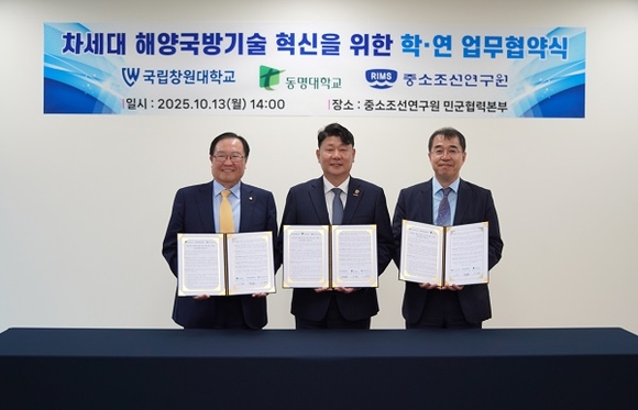국립창원대학교는 중소조선연구원, 동명대학교와 경남 창원시 중소조선연구원 민군협력본부가 위치한 특수선박센터에서 ‘차세대 해양국방기술 혁신을 위한 상호협약’을 체결했다고 14일 밝혔다.