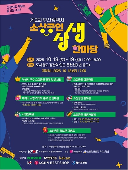 소상공인 제품 소비 촉진과 상생의 가치를 확산하기 위해 마련된 이번 행사는 개막식, 판매전, 부대행사, 공연 및 체험 프로그램 등으로 다채롭게 구성된다. 개막식은 18일 오후 5시 온천천 야외공연장에서 열리며, 박형준 부산시장을 비롯해 김석준 교육감, 윤일현 금정구청장, 송치영 소상공인연합회 중앙회장 등 30여 명의 내빈이 참석해 개막을 축하할 예정이다.