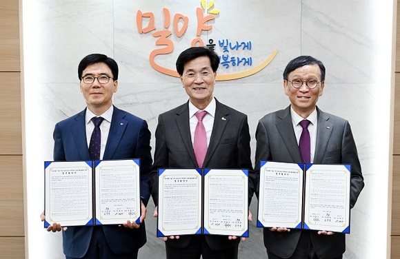경남 밀양시는 16일 시장실에서 한국재료연구원, 한국남부발전과 밀양 나노융합 국가산업단지 중심의 탄소저감·글로벌 탄소 규제 대응을 위한 '탄소 저감·지역경제 공동 활성화 모델' 개발을 위해 3개 기관 간 업무협약을 체결했다.