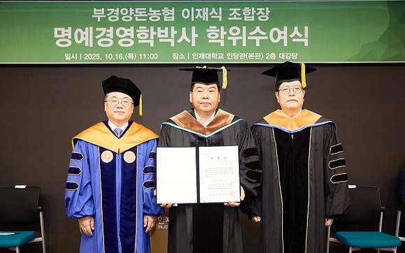 인제대학교는 16일 오전 김해캠퍼스 본관 대강당에서 지역 양돈산업의 혁신과 ESG 경영을 이끌어온 이재식 부경양돈농협 조합장에게 명예경영학박사 학위를 수여했다고 밝혔다.