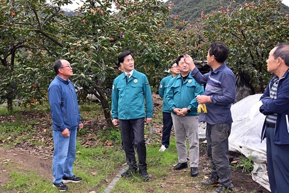 안병구 밀양시장이 21일 상동면 일원 떫은감 재배지를 방문해 최근 확산하고 있는 탄저병 피해 상황을 점검하고, 피해 임가의 애로사항을 청취했다.