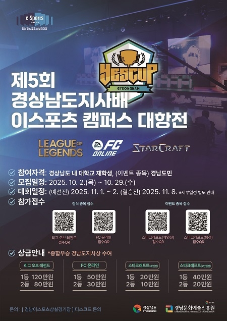 경남문화예술진흥원이 주관하는 이번 대회는 1일 개막식을 시작으로 2일까지 온라인 예선전을 거쳐 8일 결승전을 통해 경남 도내 이스포츠 최강 대학을 가릴 예정이다.