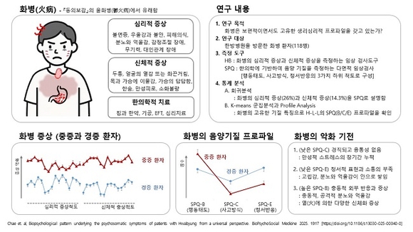 해당 논문은 ‘Biopsychological pattern underlying the psychosomatic symptoms of patients with Hwabyung from a universal perspective(화병 환자의 심신증상에 내재된 보편적인 생물심리 프로파일의 분석)’으로, 부산대 한의학전문대학원 채한 교수 연구팀이 경희대 한의과대학/강동한방병원 김종우 교수팀 및 경성대 심리학과 이수진 교수팀과의 다학제 연구로 진행했다.