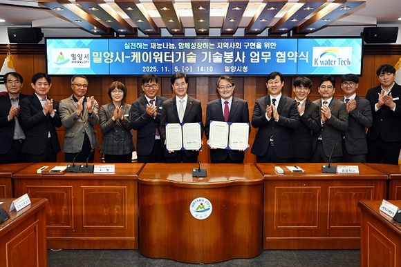 경남 밀양시와 케이워터기술(주)은 5일 시청 소회의실에서 '실천하는 재능나눔, 함께 성장하는 지역사회 구현을 위한 기술봉사 업무협약'을 체결했다.