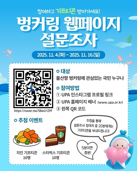 울산항만공사(UPA)는 친환경 선박연료 급유 활성화를 위한 기반 조성의 일환으로, ‘울산항 벙커링 전용 웹페이지 구축’을 위한 대국민 설문조사를 오는 16일까지 진행한다고 10일 밝혔다.