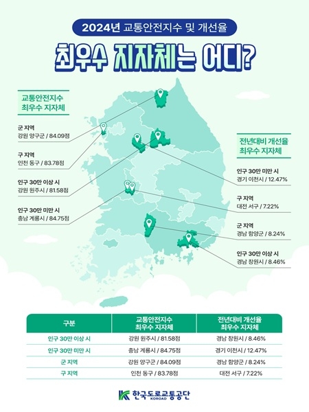 경남 함양군은 한국도로교통공단에서 전국 기초지방자치단체를 대상으로 시행한 '2024년도 교통안전지수 평가'에서 개선율 부문 전국 군지역 '최우수 지자체'로 선정됐다고 12일 밝혔다.