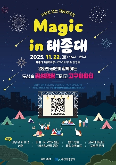 부산관광공사는 오는 22일 태종대유원지 내 ‘드라이브 인(Drive in) 영도 CGV’에서 ‘자동차 없는 자동차극장, 매직 인 태종대(Magic in Taejongdae)’ 행사를 개최한다고 밝혔다.