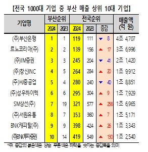 올해 부산 매출 1위는 지난해에 이어 부산은행이 차지했다. 다만 전국순위는 119위로 전년(111위)보다 8계단 하락해 상위 100대 기업 진입에는 실패했다. 부산 매출 2위는 신차 ‘그랑 콜레오스’ 흥행에 힘입어 전국순위가 17계단 오른 르노코리아(139위)가 차지했다.