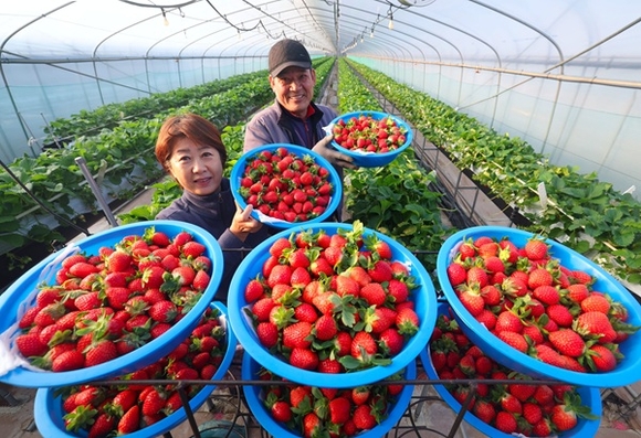 18일 오전 경남 함양군 지곡면 창촌마을 이감성씨 부부가 딸기 하우스에서 새콤달콤한 '설향' 딸기를 들어 보이고 있다.