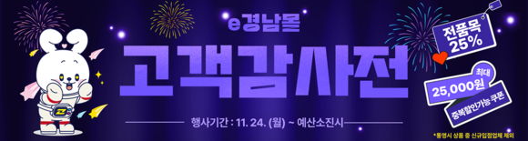 이번 기획전은 e경남몰의 모든 상품에 25%(최대 2만 5천 원) 할인 혜택을 제공한다. 2023년부터 올해까지 e경남몰에 신규 입점한 업체의 상품에는 추가 25% 할인(최대 2만 5천원)이 적용돼 최대 50% 할인 혜택(최대 5만 원)을 누릴 수 있다.