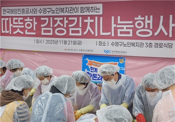 한국해양진흥공사가 지난 21일 부산 수영구노인복지관에서 지역 내 독거노인 등 취약계층의 건강한 겨울나기를 지원하기 위해 ‘2025 따뜻한 겨울나기, 희망더(+)海 김장김치 나눔 봉사’를 실시했다고 밝혔다.