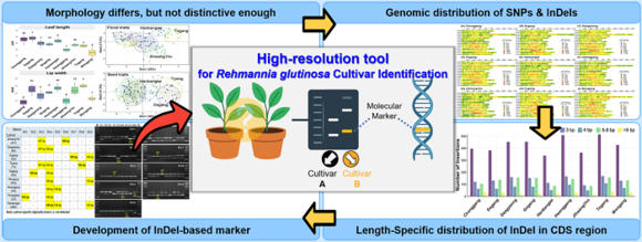 연구팀은 국내에서 재배되는 9개 지황 품종을 대상으로 잎·꽃·줄기·종자를 포함한 23개 형태 형질을 정밀 분석하고, 전장 유전체 재시퀀싱(Whole-genome resequencing)을 수행해 대규모 단일염기다형성(Single Nucleotide Polymorphism, SNP) 및 삽입·결실(Insertion-Deletion, InDel) 변이를 발굴했다. 이후 품종 간 구분력이 큰 핵심 형태형질을 선별하고, 고신뢰 InDel 변이 기반으로 9종의 다형성 분자표지(RV1-RV9)를 개발해 간단한 PCR만으로 품종을 정확히 식별할 수 있는 InDel 기반 진단·유전자형 분석 시스템을 구축했다.