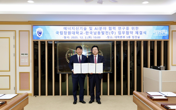 남동발전은 2일 국립창원대에서 강기윤 남동발전 사장, 박민원 국립창원대 총장 등 관계자들이 참석한 가운데, 에너지신기술 개발 및 기술인력 양성을 위한 업무협약을 체결했다고 밝혔다.