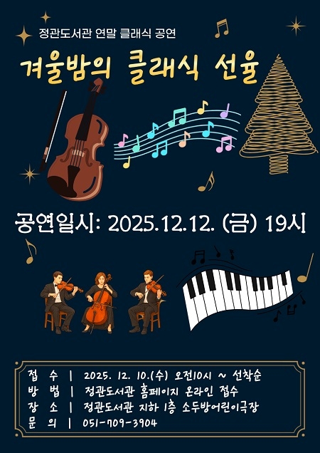 부산 기장군이 연말을 맞아 오는 12일 정관도서관에서 지역 주민들에게 따뜻한 감성과 휴식을 전하는‘겨울밤의 클래식 선율’ 공연을 연다고 밝혔다.
