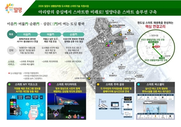 밀양시는 삼문동 일원에 불법주정차 문제 해소를 위해 주차정보를 전광판·홈페이지에 실시간으로 알리는 '스마트 주차공유'와 실시간 버스 도착 정보와 냉난방 시스템을 갖춘 '스마트 버스 정류장(쉘터)'를 설치한다. 밀양시립도서관, 아리랑 어울림센터 등 도시재생거점 시설에는 '스마트 미디어아트', '스마트 키오스크'를 설치한다.