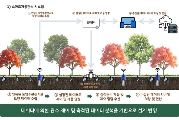 ‘스마트 자동관수 시스템’은 식물에 필요한 물을 자동으로 공급하고 제어하는 관수 시스템이다. 토양수분센서 및 기상정보 데이터를 기반으로 수목에 필요한 물을 정밀하게 제공해 토양 내 수분 함량을 일정하게 유지할 수 있도록 한다. 또한 액상 비료 자동공급 시스템과도 연계돼 수목 생장을 촉진할 뿐 아니라, 탄소흡수량 향상에도 도움이 될 것으로 기대된다.