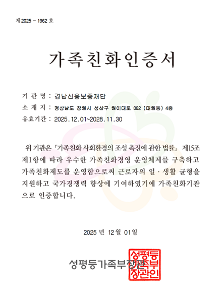 이번 재인증으로 경남신보의 가족친화인증은 2025년 12월 1일부터 2028년 11월 30일까지 3년간 유효하다. 2020년 최초 인증 이후 제도 개선과 운영을 지속해 오며, 3회 연속 가족친화인증을 유지하고 있다.