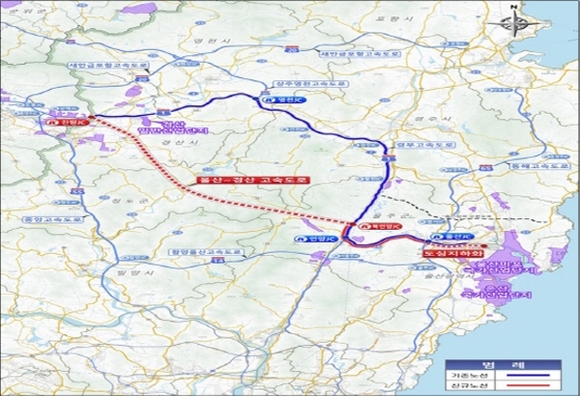 ‘울산~경산 고속도로’는 울산 울주군 언양읍에서 경산시 진량읍을 잇는 총연장 50㎞, 4차로 규모로 계획돼 있다. 도로가 개설되면 산업물동량 이동 시간이 크게 단축돼 울산 및 경북 지역 기업의 경쟁력 강화와 기업 투자 환경 개선을 통한 지역 경제 활성화가 기대된다.
