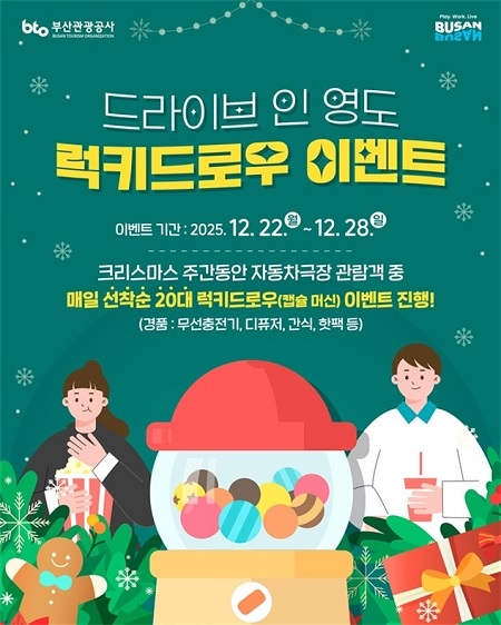 부산관광공사가 크리스마스 특수 기간을 맞아 태종대유원지 자동차극장에서 ‘드라이브 인 영도 럭키드로우’이벤트를 오는 22일부터 28일까지 운영한다고 밝혔다.