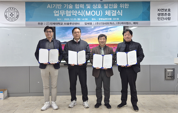 인제대학교 AI솔루션센터는 지난 22일 ㈜ITB네트웍스, ㈜케이랩스, 메타와 AI 기반 기술 협력 및 상호 발전을 위한 업무협약을 체결했다고 23일 밝혔다.