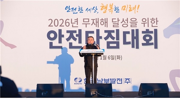 한국남부발전이 2026년 새해를 맞아 노사가 함께 무재해 달성을 다짐하며 안전 경영 의지를 재확인했다. 남부발전은 6일 오전 광안리 해변에서 ‘2026년 무재해 달성을 위한 안전다짐대회’를 열었다고 밝혔다.