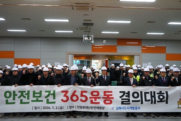 김해시도시개발공사는 올해 안전보호구 착용 의무화 시행을 앞두고, 지난 2일 민방위재난안전체험장에서 전 직원이 참여하는 '무재해·무사고 365 결의대회'를 가졌다.