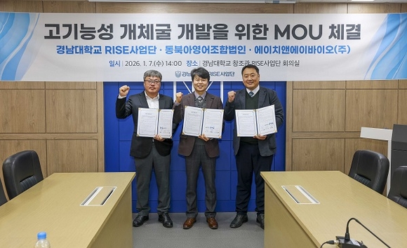 경남대학교 RISE사업단은 지난 7일 창조관에서 동북아영어조합법인, 에이치앤에이바이오(주)와 함께 고기능성 통영 개체굴 개발을 위한 산학협력 업무협약을 체결했다고 8일 밝혔다.