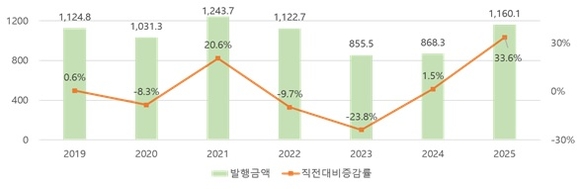 13일 한국예탁결제원에 따르면 2025년 한 해 동안 예탁원을 통한 단기사채(STB) 자금 조달 규모는 1160조 1000억 원으로 집계됐다. 이는 전년 868조 3000억 원 대비 33.6% 증가한 수치로, 2021년 1243조 7000억 원 이후 4년 만에 최대 규모다.