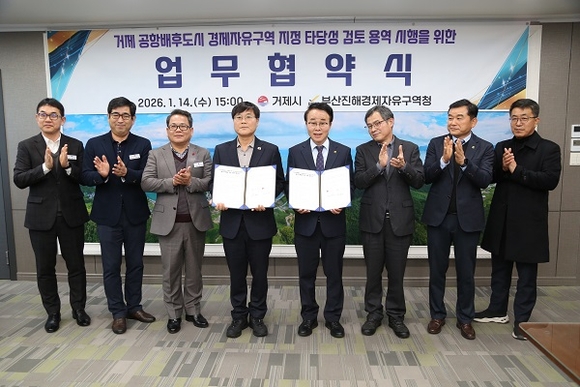 부산진해경제자유구역청과 거제시가 가덕도 신공항 건설과 연계한 거제 공항배후도시의 경제자유구역 지정을 위한 본격적인 절차에 착수했다. 부산진해경자청은 지난 14일 거제시청에서 거제시와 '거제 공항배후도시 경제자유구역 지정 타당성 검토 용역' 시행을 위한 업무협약을 체결했다고 밝혔다.