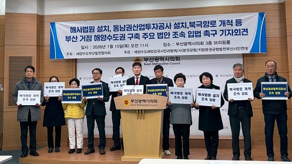해양수산부 부산 이전으로 ‘해양수도 부산’ 시대가 본격 개막했지만, 이를 뒷받침할 핵심 법안들이 국회 문턱을 넘지 못한 채 표류하고 있다는 지적이 제기됐다. 해양수도부산발전협의회는 15일 부산시의회 브리핑룸에서 기자회견을 열고 해사법원 설치, 북극항로 개척, 동남권산업투자공사 설립 등 부산을 거점으로 한 해양수도권 구축 관련 주요 법안을 새해 첫 임시국회에서 조속히 처리할 것을 국회에 촉구했다.