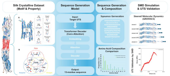국립창원대학교는 기계공학부 윤태영 교수(교신저자) 연구팀이 인공지능(AI) 트랜스포머 모델을 활용해 원하는 기계적 강도를 가진 실크 단백질 서열을 역설계하는 원천기술을 개발하고, 그 연구 성과가 공학 설계 분야의 권위 있는 국제저명학술지 ‘Journal of Computational Design and Engineering(IF: 6.1, JCR 상위 6.4%)’에 게재됐다고 23일 밝혔다.