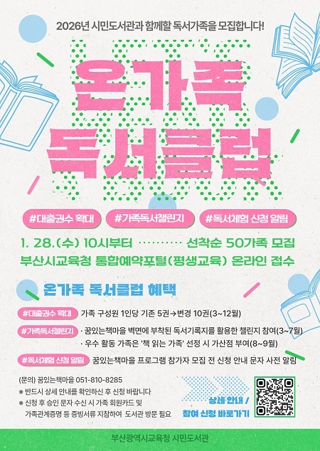 부산시민도서관이 오는 28일부터 영·유아 및 초등학생 자녀를 둔 가족을 대상으로 ‘온가족 독서클럽’ 참여 가족 50팀을 모집한다.