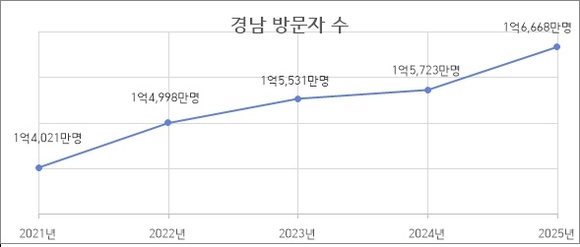 작년 경남 방문자 수는 2024년(1억 5723만 명) 대비 6.0% 증가해, 같은 기간 전국 17개 시도의 평균 증가율(5.8%)을 웃돌았다.