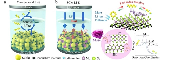 연구팀은 이러한 문제를 해결하기 위해 금속과 반도체성이 혼합된 1T/2H 구조의 이셀레늄화몰리브덴(MoSe2)을 촉매로 활용하고, 이를 활성 물질인 황과 열적으로 직접 결합시키는 전극 설계 전략을 제안했다. 이 복합 구조에서 MoSe2의 결함과 상 경계는 다수의 활성점을 형성해 폴리설파이드를 강하게 흡착해 이동을 억제하는 동시에, 전자와 리튬 이온의 전달을 가속화시켜 반응 장벽을 낮춘 것으로 연구팀은 확인했다.