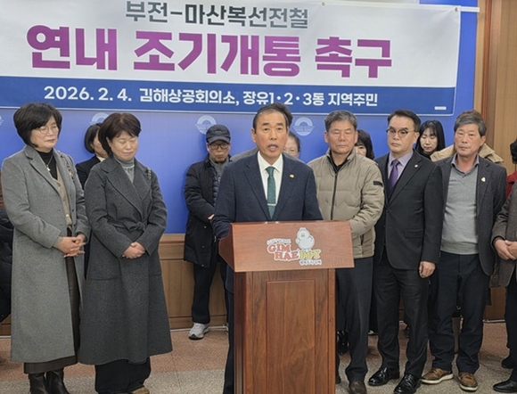경남 김해 상공계와 시민들이 4일 오전 시청 브리핑룸에서 기자회견을 갖고 부전-마산복선전철의 연내 조기 개통을 강력 촉구했다.