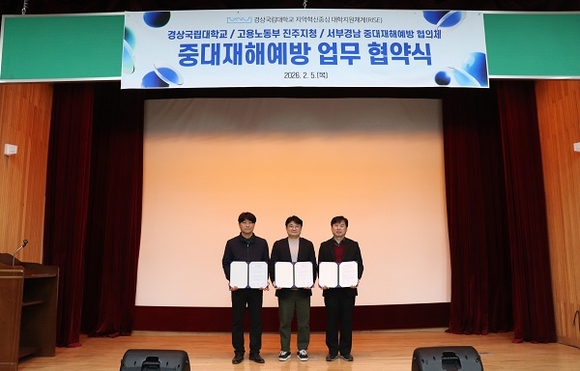 경상국립대학교 라이즈(RISE) 사업단은 지난 5일 사천시 근로자종합복지관에서 서부경남 중대재해 예방 협의체 및 고용노동부 진주지청과 업무협약을 체결했다고 6일 밝혔다. 이번 협약은 지역 내 산업현장의 중대재해 예방과 임직원 및 지역민의 건강증진을 목표로, 대학·공공기관·지역 협의체가 참여하는 민·관·학 연계 협력 거버넌스를 구축하기 위해 추진됐다.