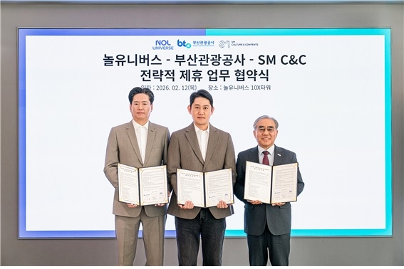 부산관광공사는 놀유니버스, SM C&C와 함께 2026 BOF의 성공적인 개최와 관광객 유치, 티켓 판매·운영을 위한 업무협약(MOU)을 체결했다고 13일 밝혔다. 협약식은 지난 12일 경기도 성남시 금토동 제2판교 테크노밸리에 위치한 10X타워에서 열렸으며, 이정실 부산관광공사 사장을 비롯해 이철웅 놀유니버스 대표, 홍준화 SM C&C 광고사업부문 대표 등 주요 관계자들이 참석했다.