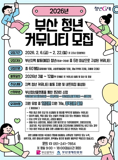 부산경제진흥원이 ‘2026년 청년 커뮤니티 활동 지원사업’ 참여팀을 오는 22일까지 모집한다고 밝혔다. 이 사업은 공통 관심사를 기반으로 한 청년 커뮤니티 활동을 지원해 다양한 활동 기반을 조성하고 사회참여를 활성화하기 위해 마련됐다.