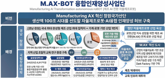 국립창원대 ‘M.AX-BOT 융합인재양성 사업단’은 ‘Manufacturing AI Transformation autonomous roBOT(제조 AI 전환 자율제조로봇)’의 약자로, 경남·창원 지역이 보유한 국내 최대 완성형 제조 산업 집적지라는 강점을 기반으로 한다. 사업단은 산업 분야별 맞춤형 자율제조로봇·AI 융합 전문 인력 양성과 교육 인프라 구축을 핵심 목표로 추진된다.
